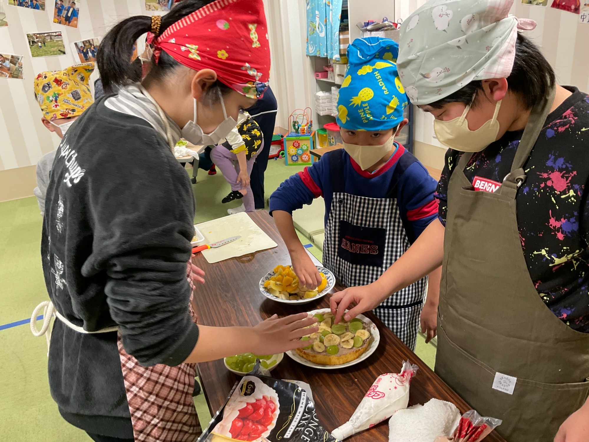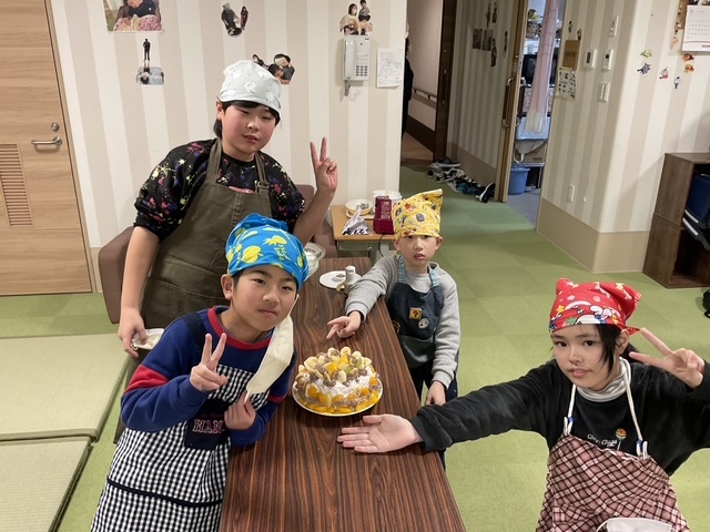 今年のクリスマス会は、3班に分かれてそれぞれ作りたいケーキを作ってもらいました。話し合いを重ね、とても可愛いケーキだ出来ました。