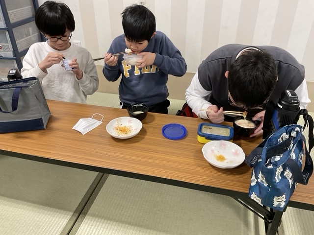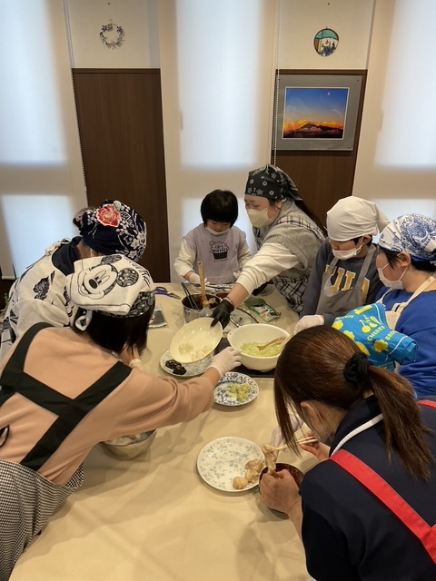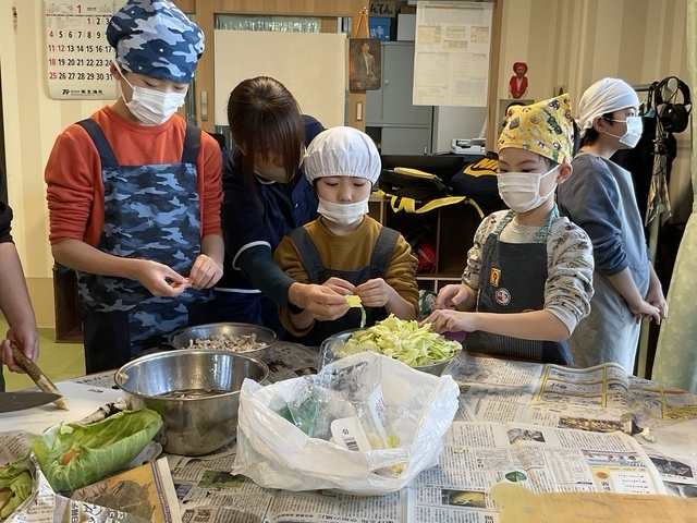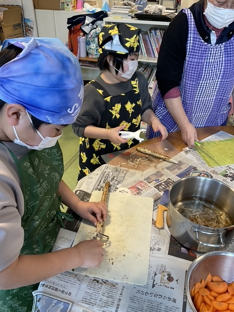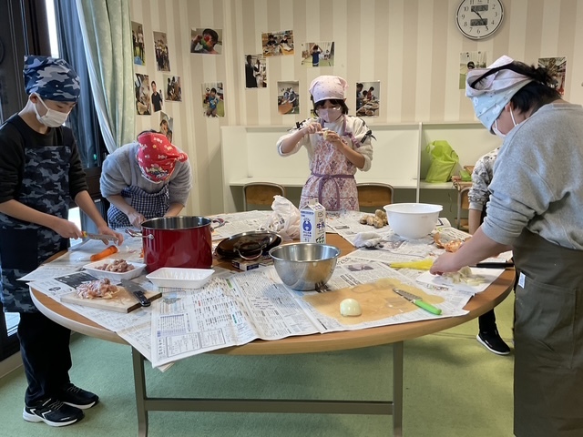 今回は寒い冬にピッタリの、シチューやせんべい汁、クラムチャウダーなどを作りました。いつもはあまり食べない子も、皆で作ったものはおいしそうに食べていました。