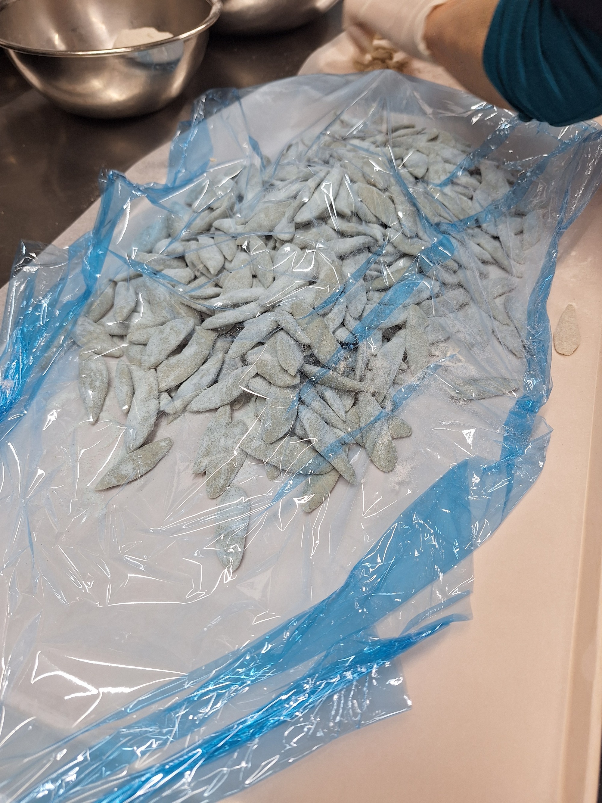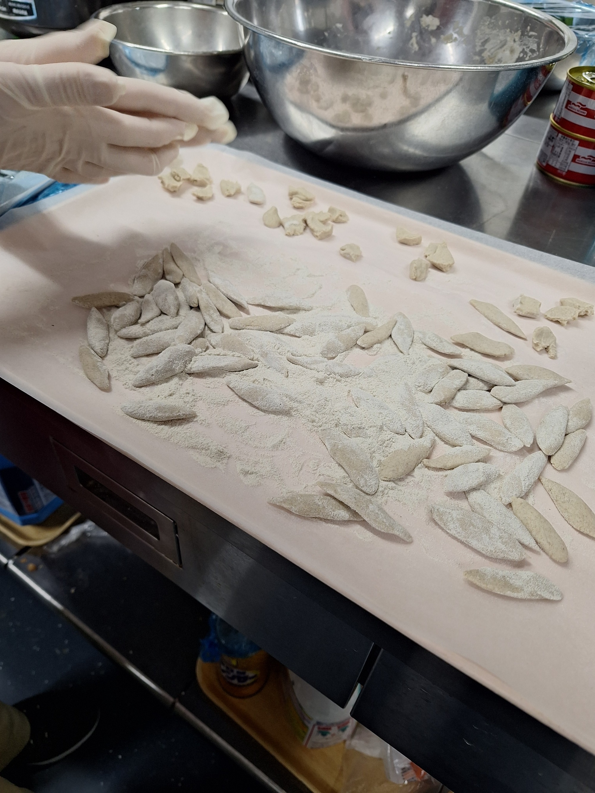 乾燥防止でラップをしています。この日はベテラン調理員から若手調理員へ作り方を伝授していました。