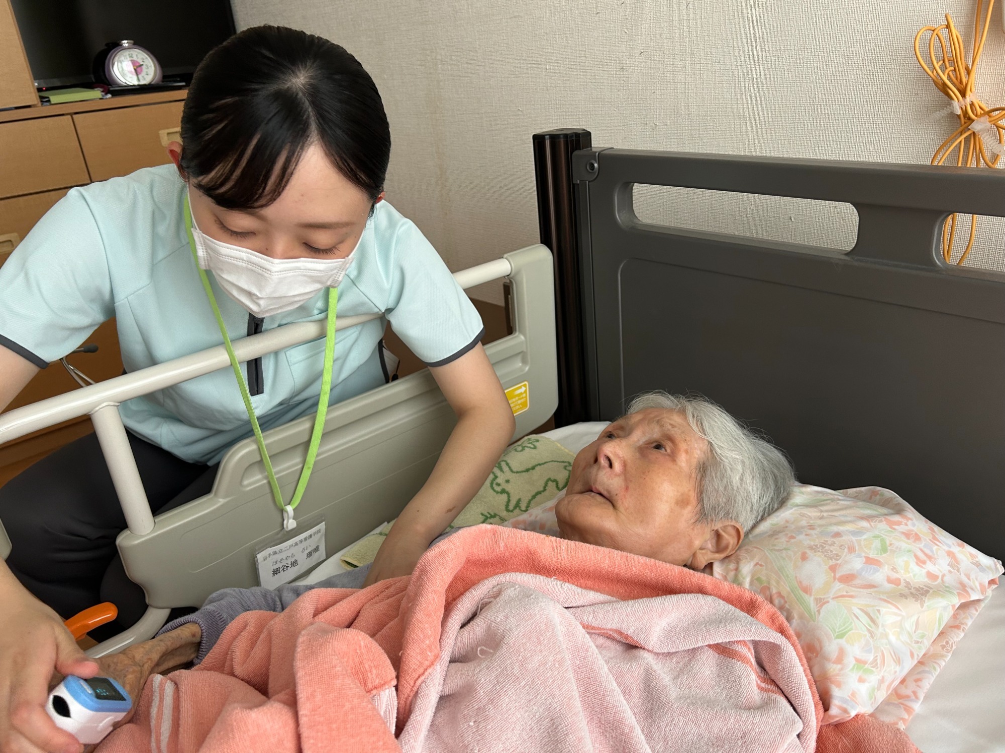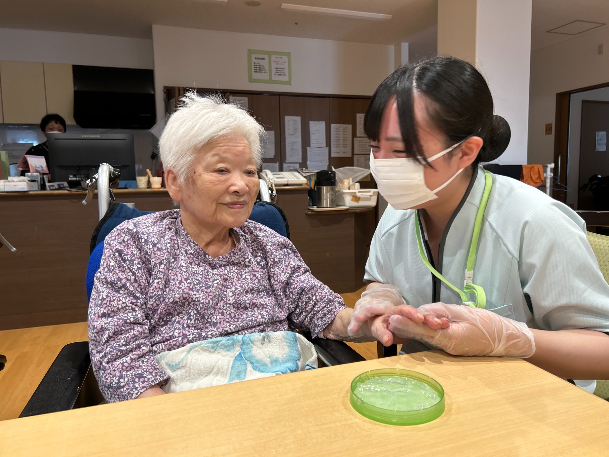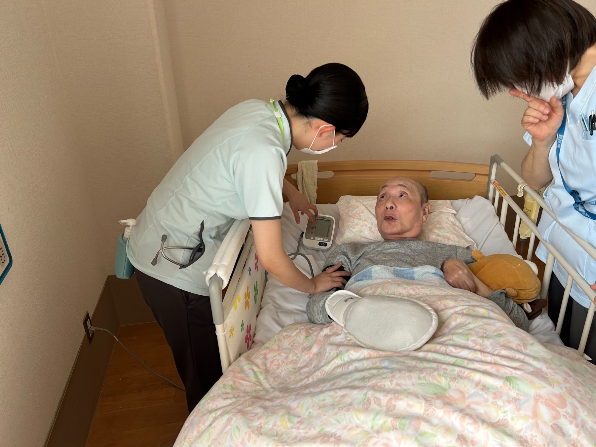 バイタル測定や、軟膏処置など体験しました。いつか、看護師になって、施設に来てくださいね。お待ちしております。