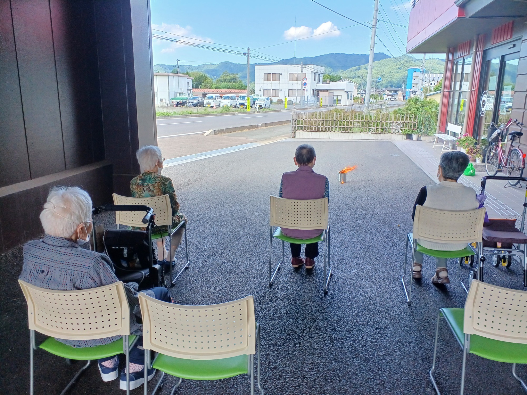 コロナが終息せず、規制のかかったままですが、協力医より、天候もいいので、「屋外での面会を始めよう」と話があり、さっそく、屋外面会できています。きらりは、「面会専用ブース」がありませんので、玄関ポーチでの面会となります。しかし、面会している様子も外からは、見えませんので、外からの視線も気になりません。