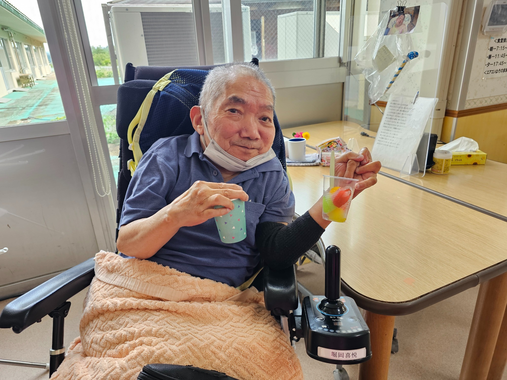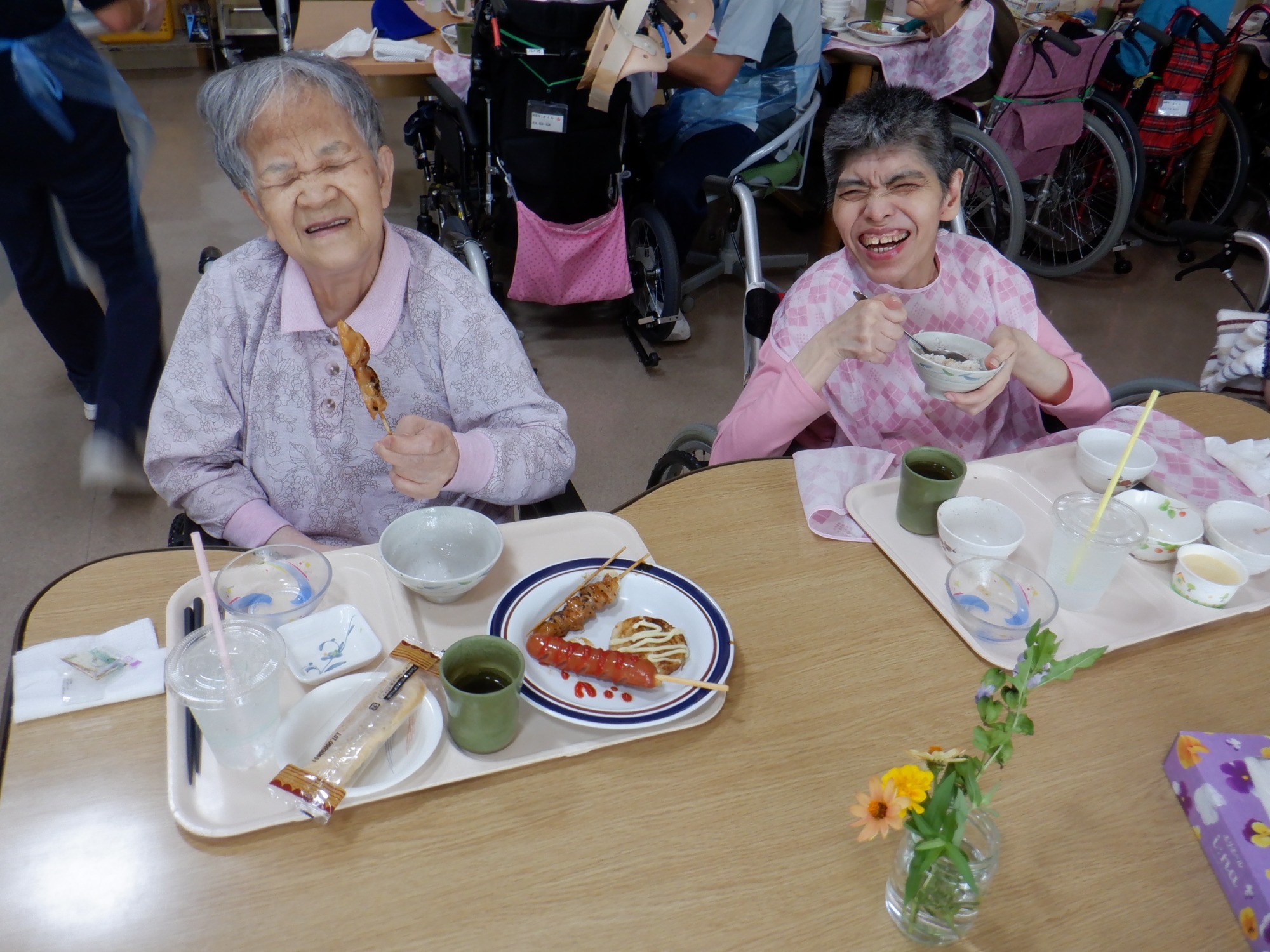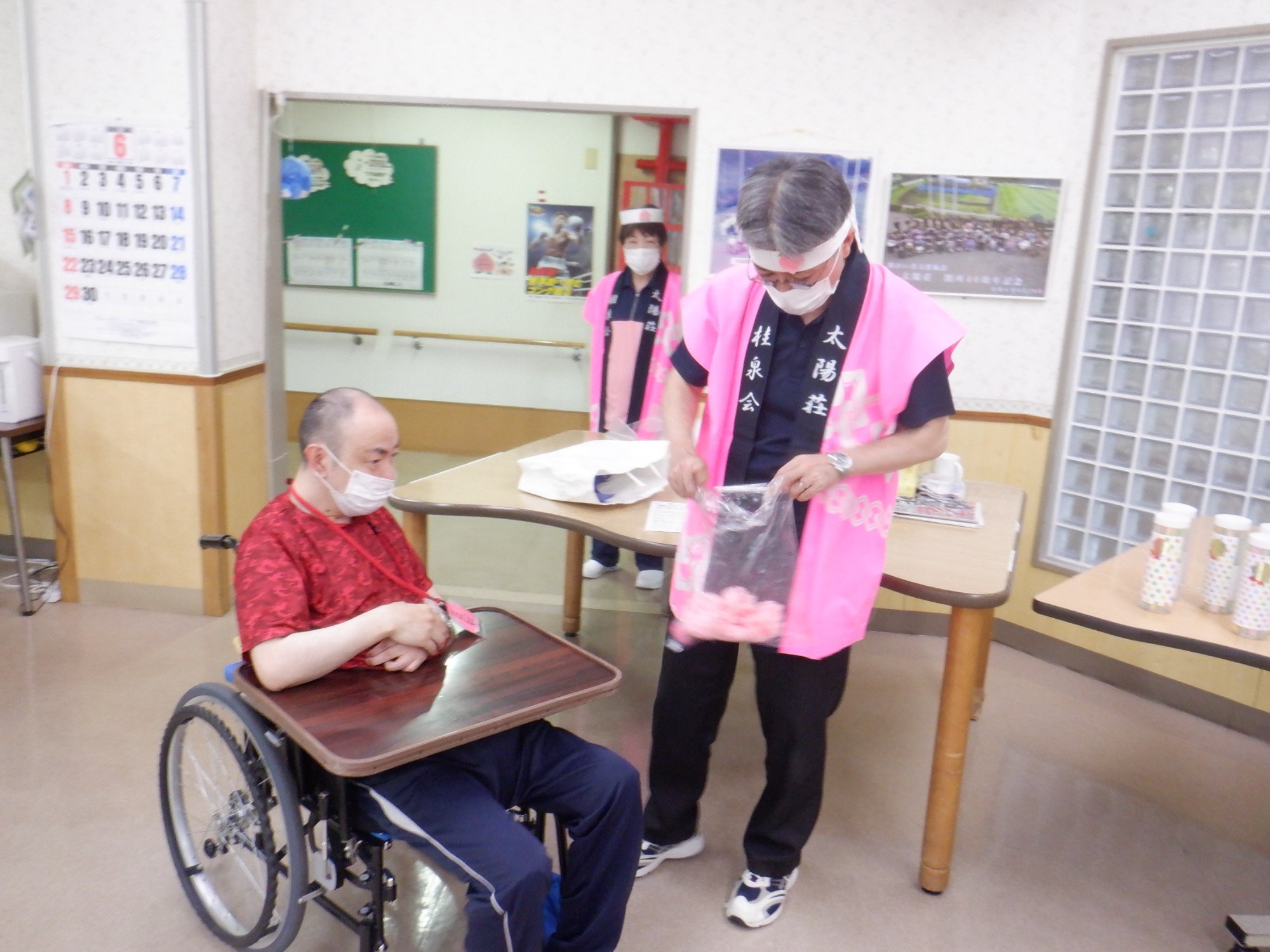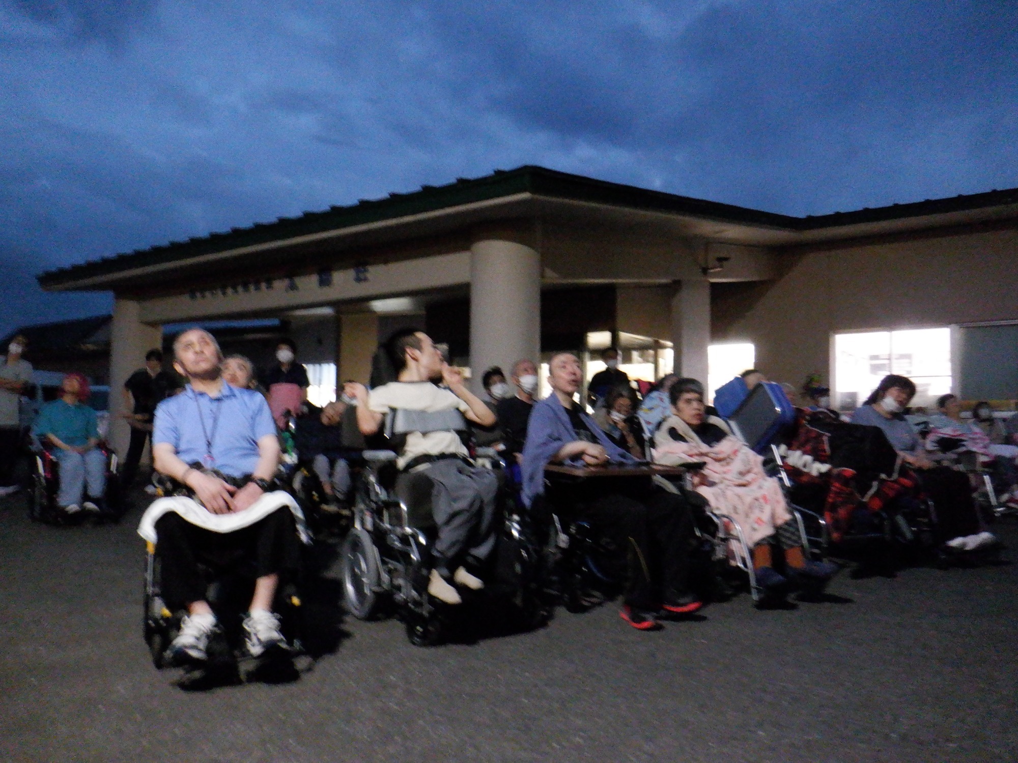 9月4日、今年は「喫茶・くじ引き・花火」を行いました。利用者様は、「欲しかった景品!」「今回の景品どれもいいね!」「この景品、来年使う。ありがとうございます。」と喜んでいただきました。夕方の花火をみて、「うわ~きれい~!」「夏ですね!」「ちょっと寒いけど、見る事が出来て良かった。」「来年も、花火見たい!」などの感想を頂き、今年も大盛況に終わりました。