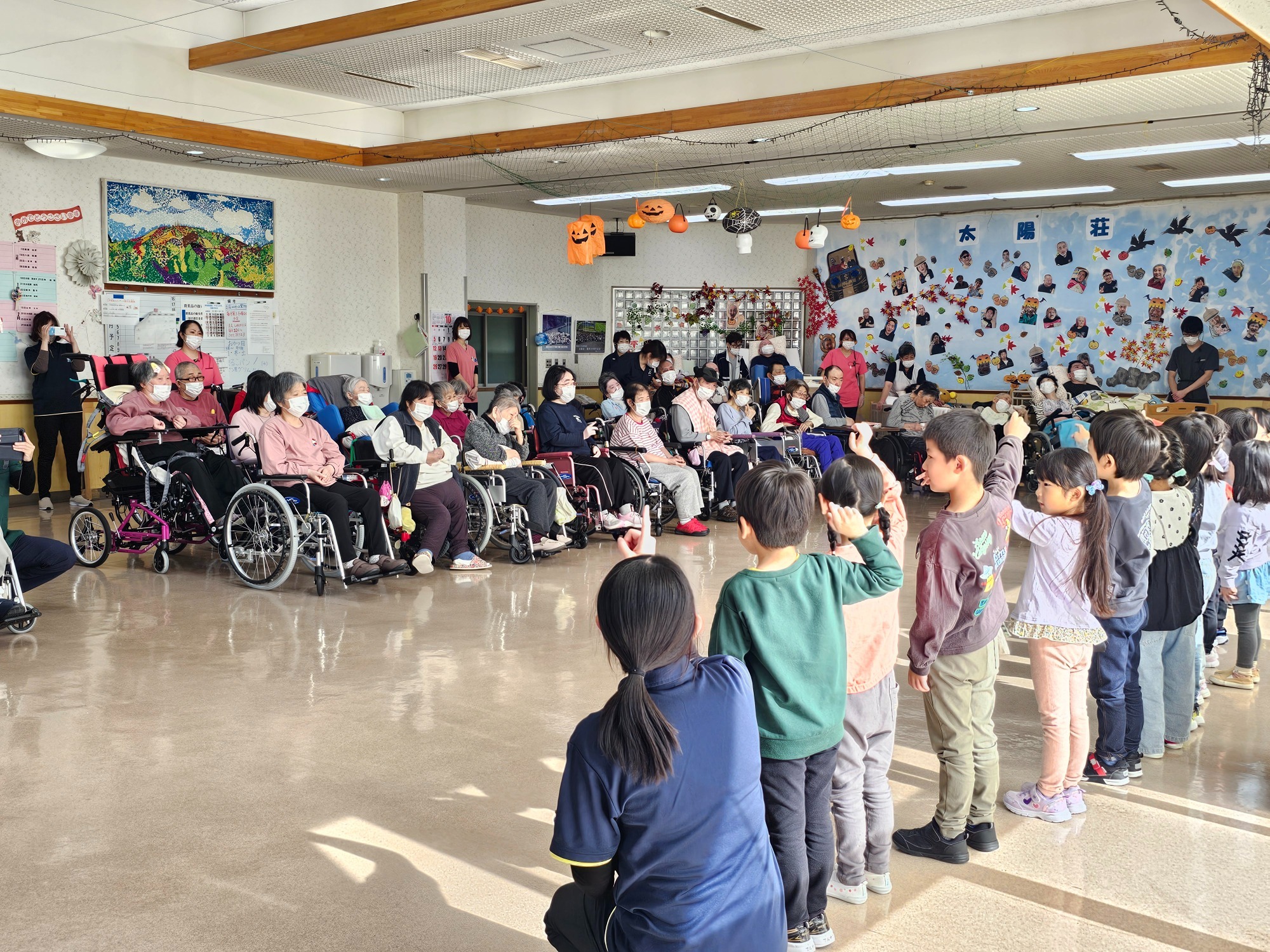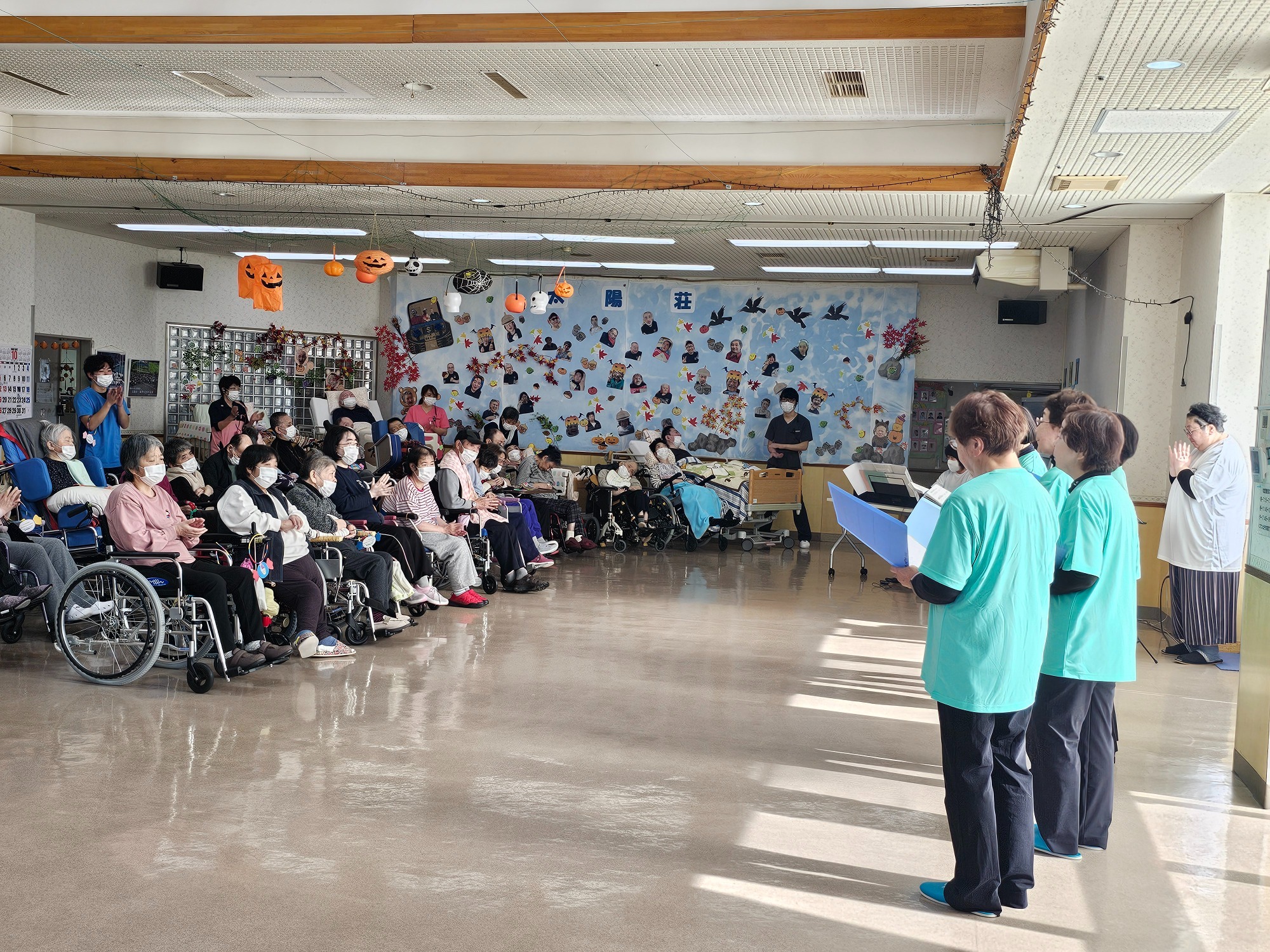 10月30日、慰問が来園されました。地域の晴山保育園様のダンス・童話を歌う会のコーラス・中村美由紀さんと民謡保存会OBの歌を鑑賞しました。利用者様は「有名人が来たの?芸能人?」「可愛いね。小さな子供たち」と言う感想もあり、「感動の涙があり、笑いもあり」とても楽しませて頂きました。ありがとうございました。