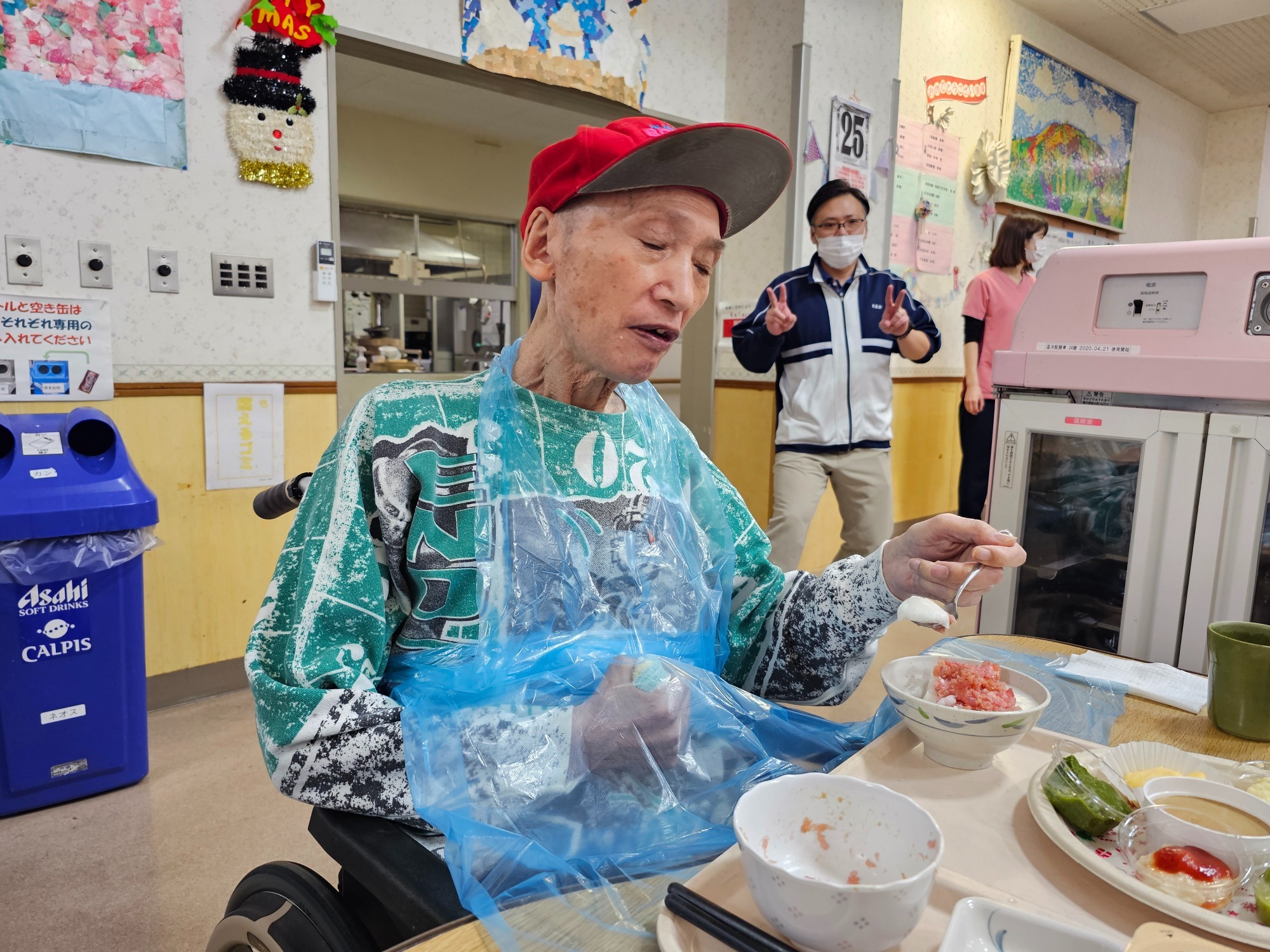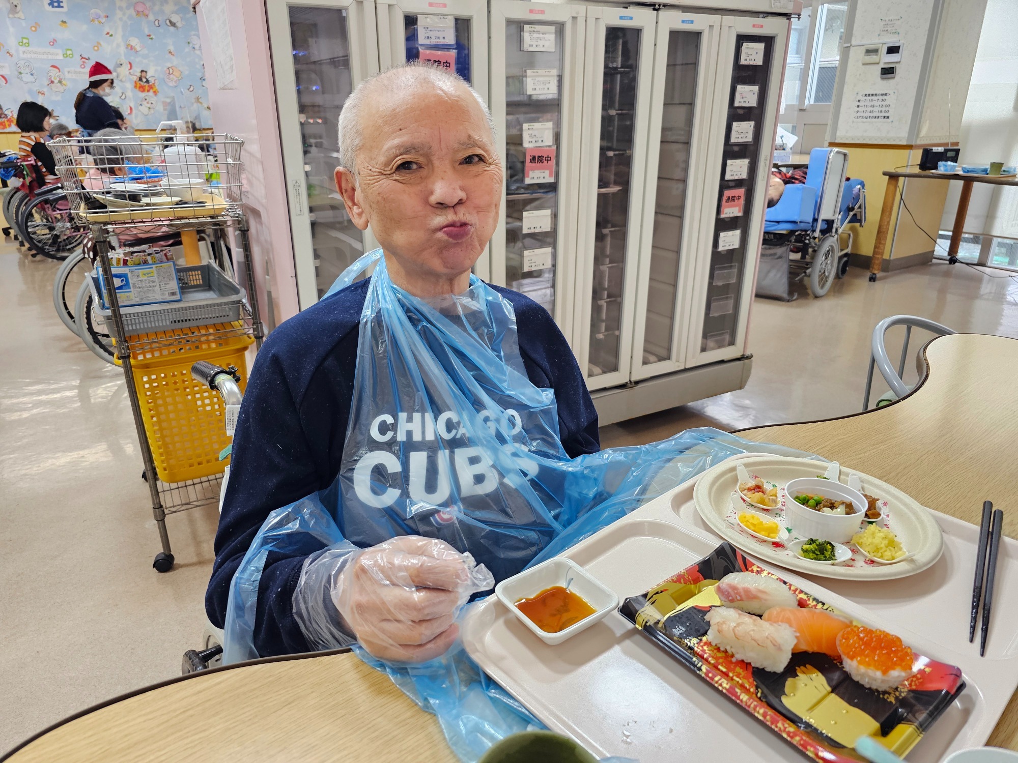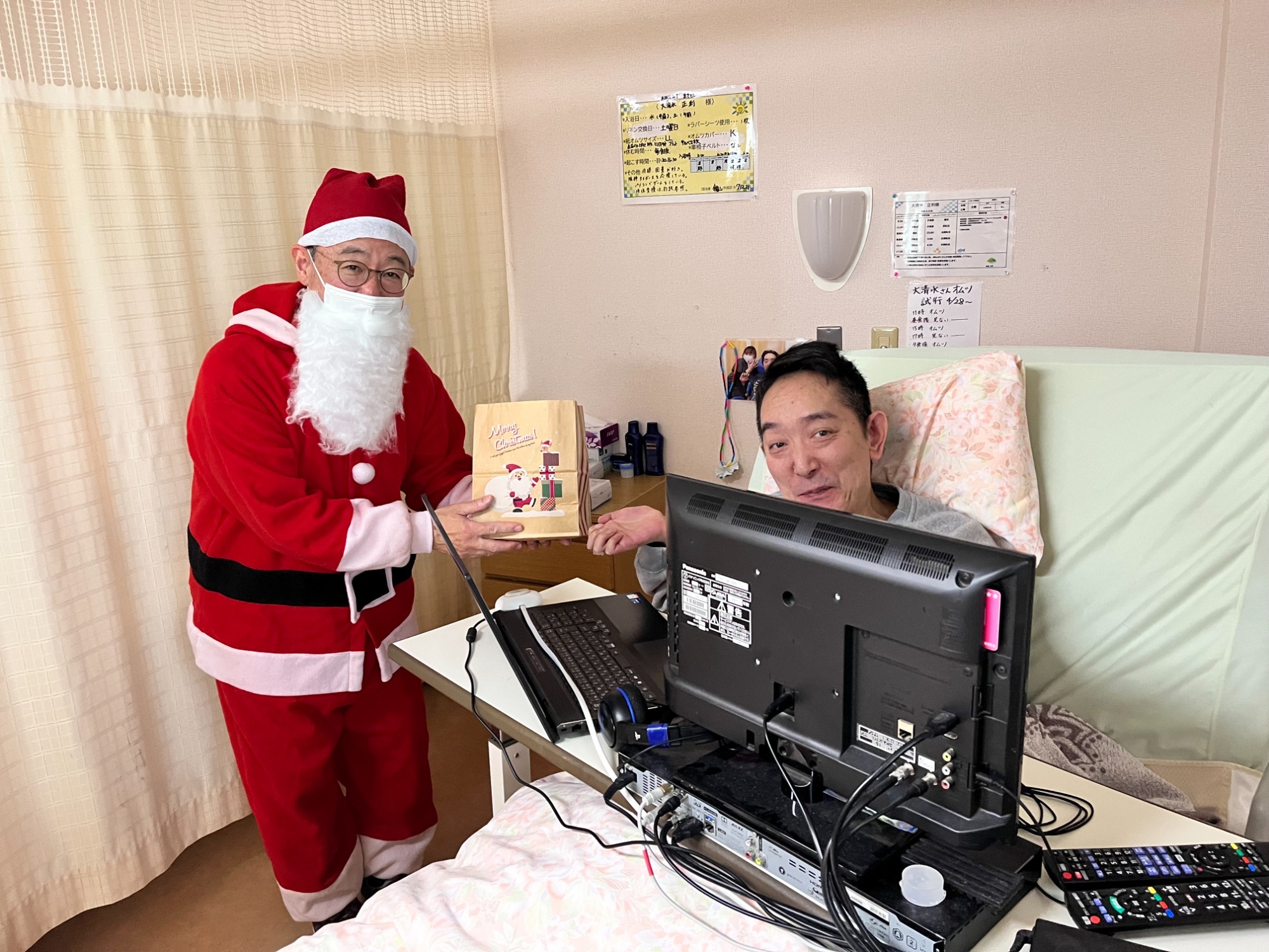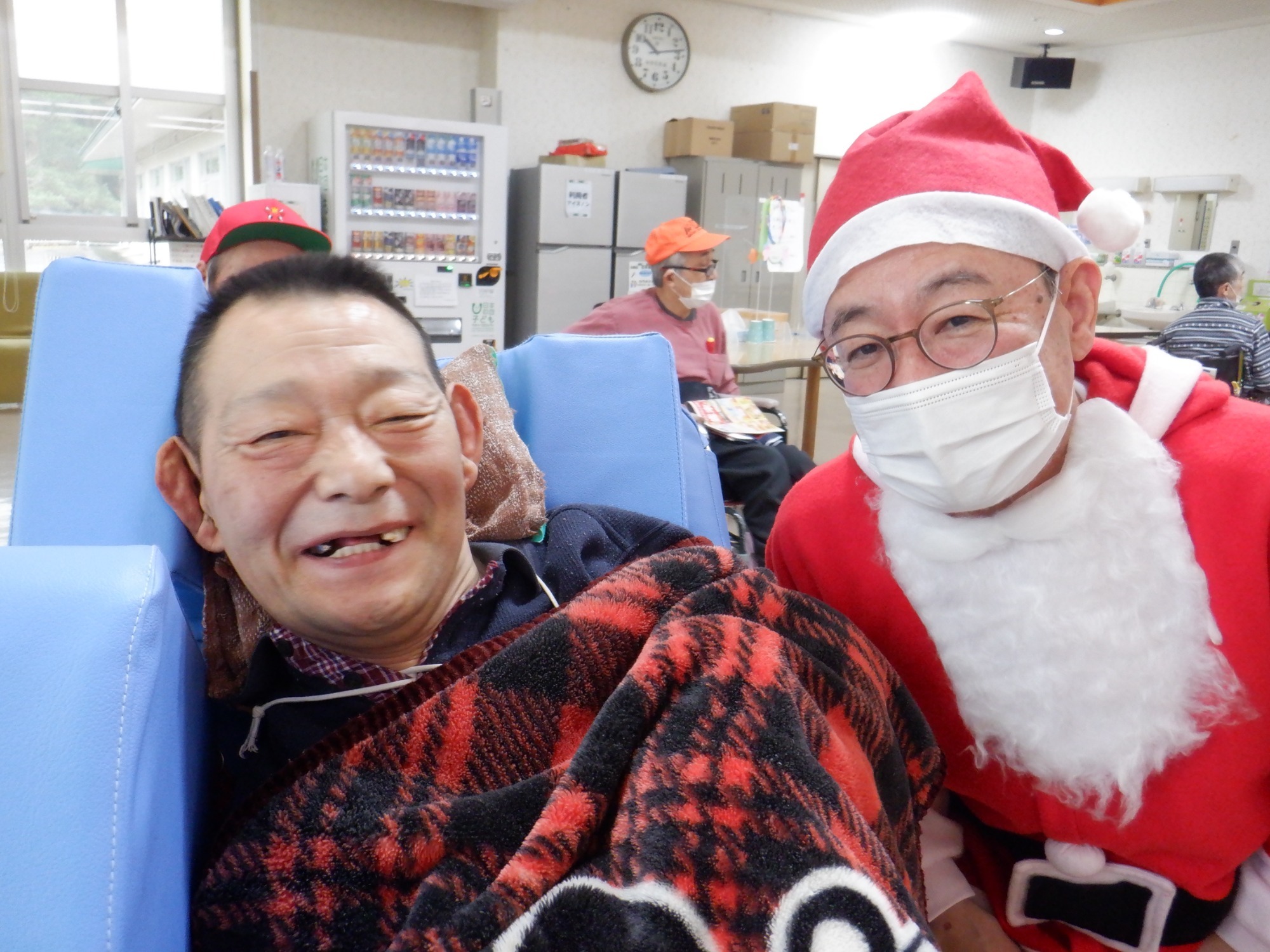 利用者様、「サンタさんだ!」「え?どこからサンタ来たの?」と驚いていました。プレゼントを受け取ると、「ありがとう」の言葉や「笑顔」が見られていました。昼食も豪華で皆さんとてもおいしそうに食べていました。